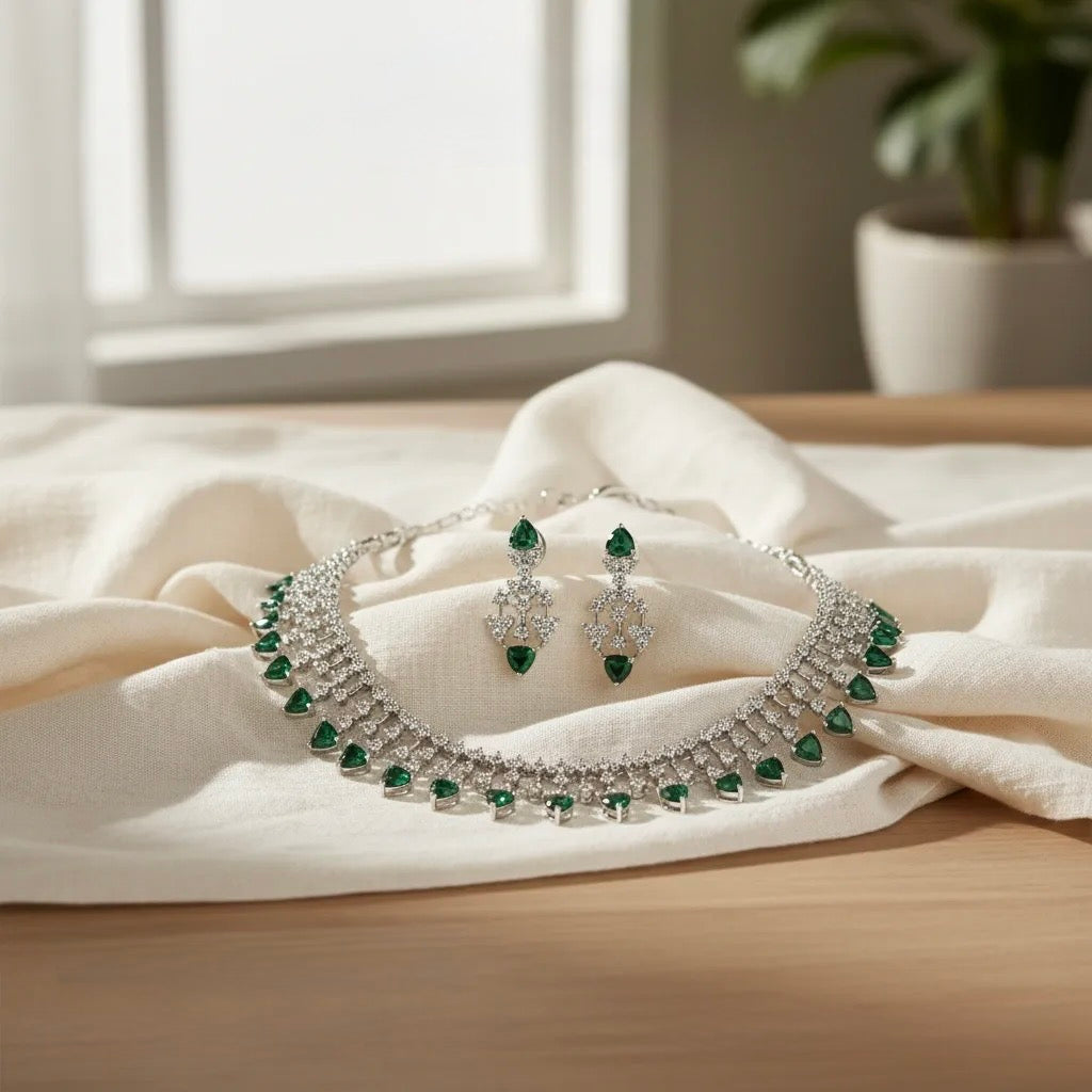 Classic Cabochon Choker Necklace Set with Earrings Emerald Green