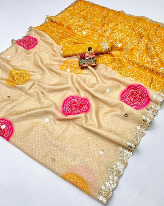 Bandhani Whisper Saree - Ivory Beige & Mustard Yellow