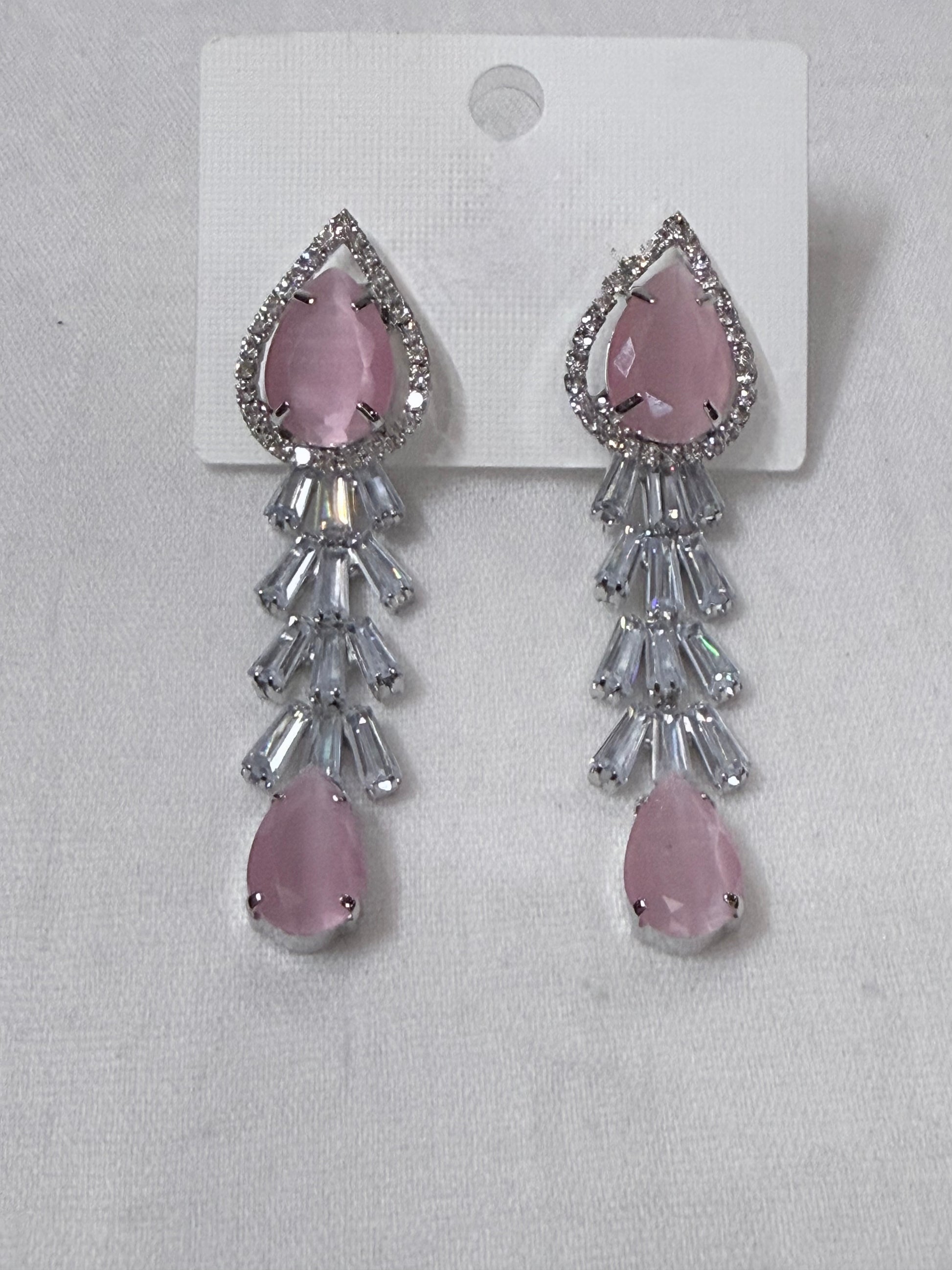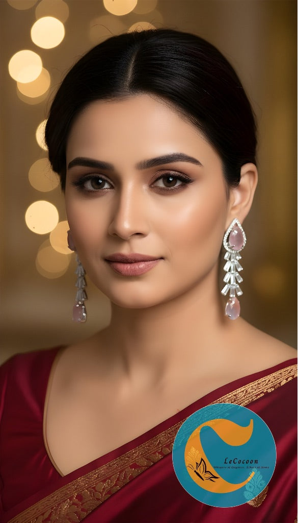 With a rhodium-plated finish, these earrings radiate a luminous silvery sheen that perfectly complements the soft, pastel pink hues. Their elegant silhouette and luxurious sparkle make them ideal for women who adore refined beauty with a modern edge.
