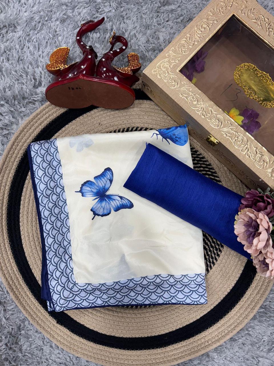 Elegant white saree with blue butterfly prints in natural crepe silk, paired with a rich Banglori blouse — lightweight, graceful and perfect for festive or elegant day wear.