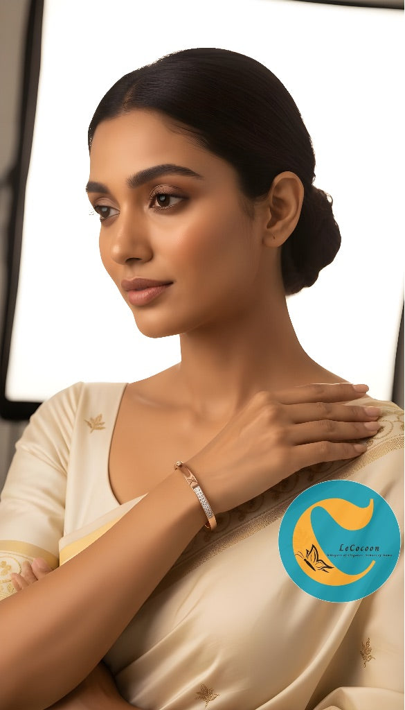 Opt for a nude or silver manicure to enhance the bracelet’s gleam. Wear it solo for refined simplicity or layer it with slim bangles for a modern, stacked look.
