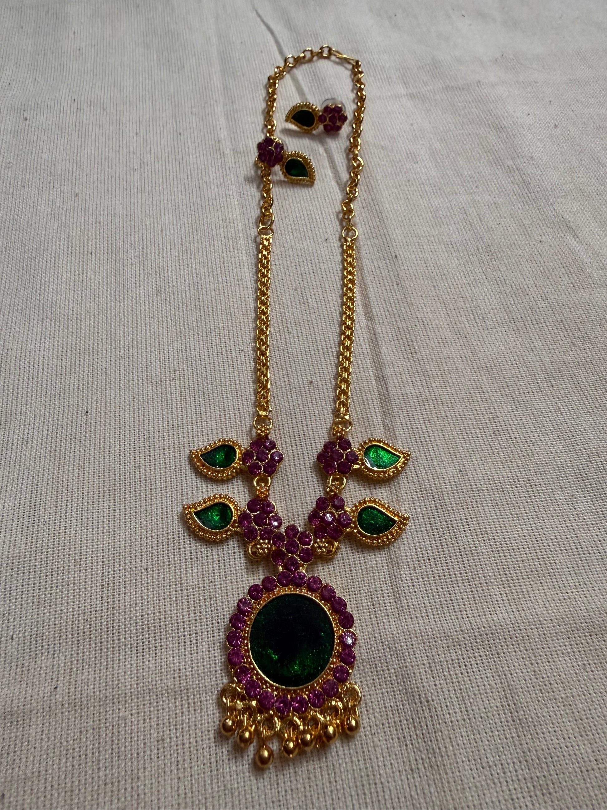 A graceful statement necklace designed with a rich gold finish, highlighted by deep green centre stone and pink floral accents. The layered pendant structure gives it a festive yet elegant appeal, making it suitable for traditional wear, family functions, and special occasions. Comes with matching earrings to complete the look effortlessly.