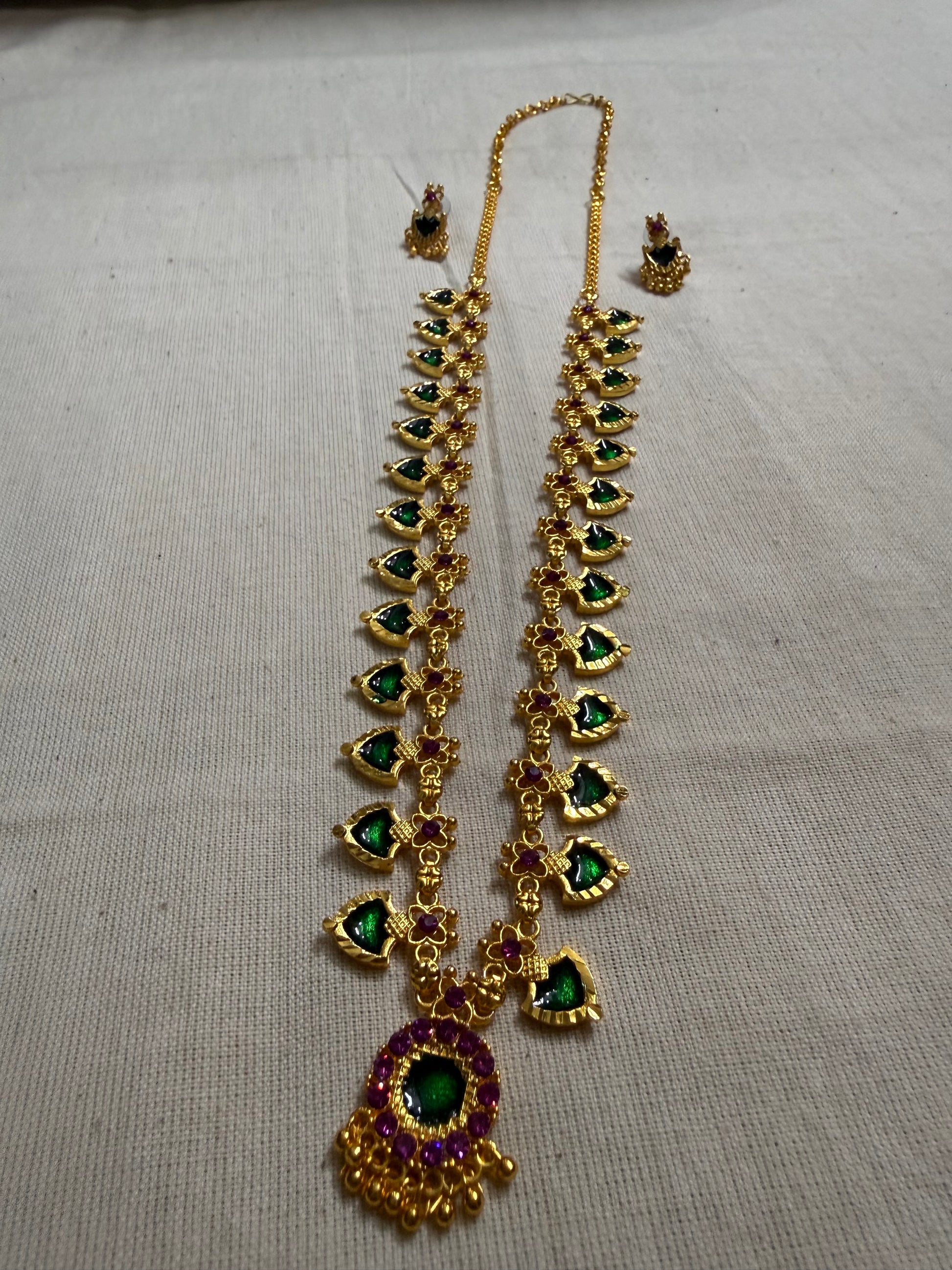 Elegant temple-inspired long necklace set from Le Cocoon featuring intricate stone detailing, a statement pendant, and matching earrings—perfect for festive and traditional wear.