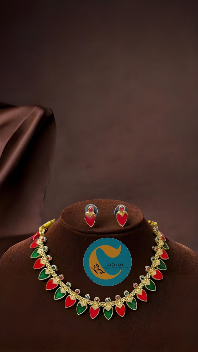 Elegant Leaf Dual-Tone Red and Green Motif Necklace Set