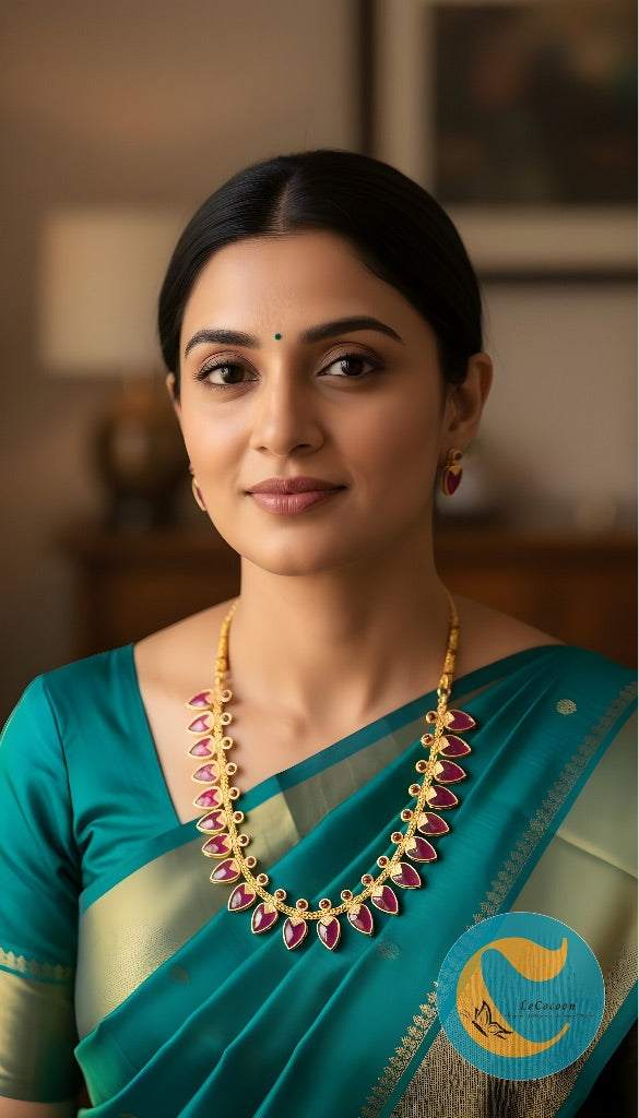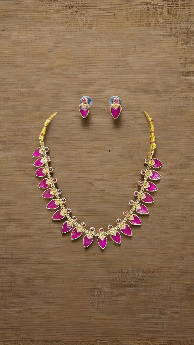 A graceful design featuring leaf-shaped motifs adorned with semi-precious stones, beautifully set in a gold-tone base. Each necklace comes with matching stud earrings, perfect for festive occasions, weddings, or gifting.