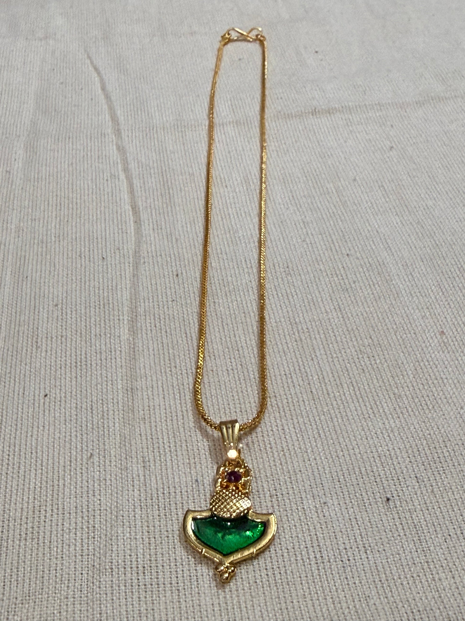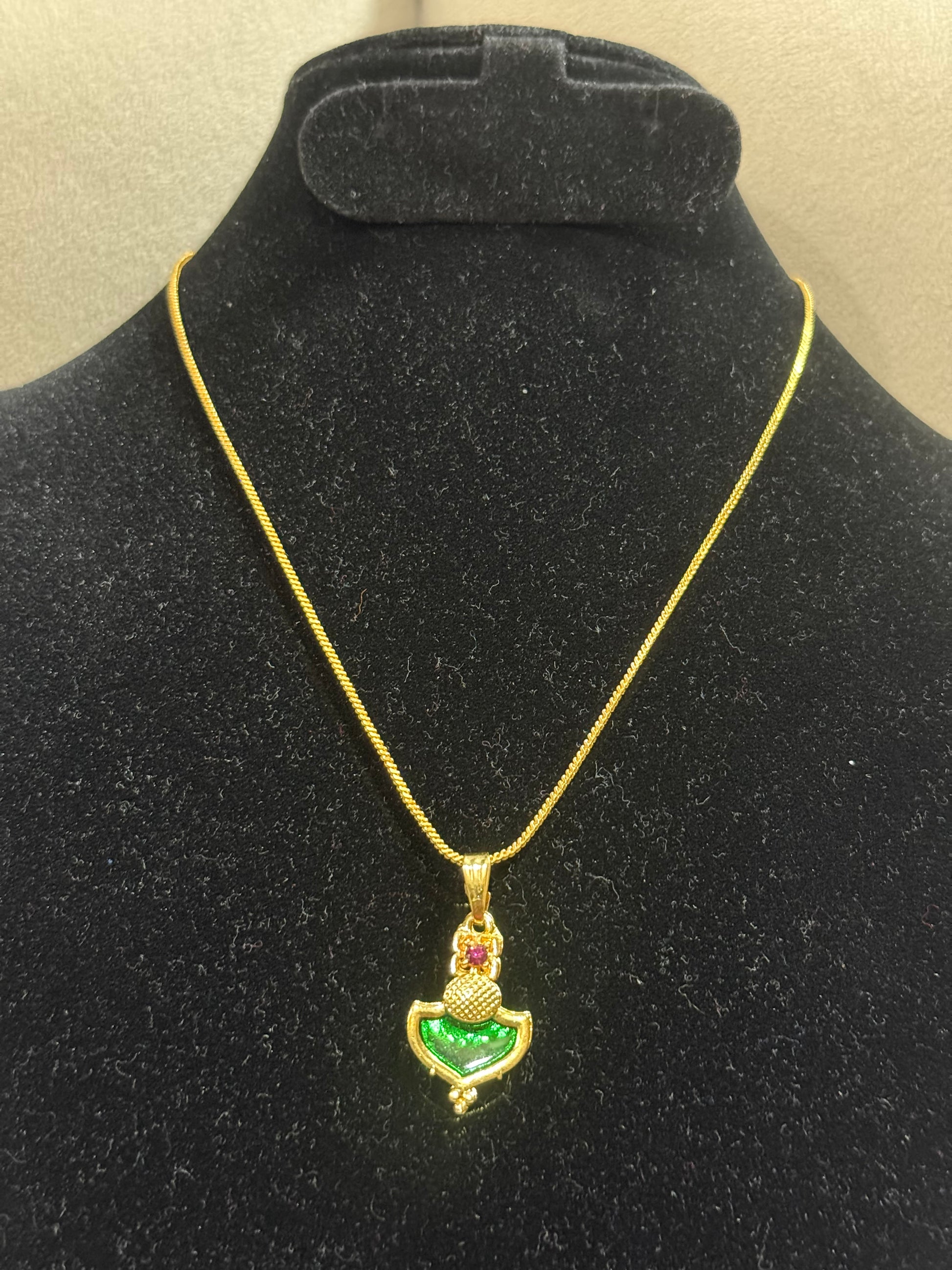 Delicate, minimal, and effortlessly elegant — the Emerald Grace Invisible Chain Pendant Set is designed for women who love subtle sophistication. Featuring a finely crafted green pendant with intricate gold detailing and a hint of ruby-toned stone work, this set beautifully blends tradition with modern everyday styling.