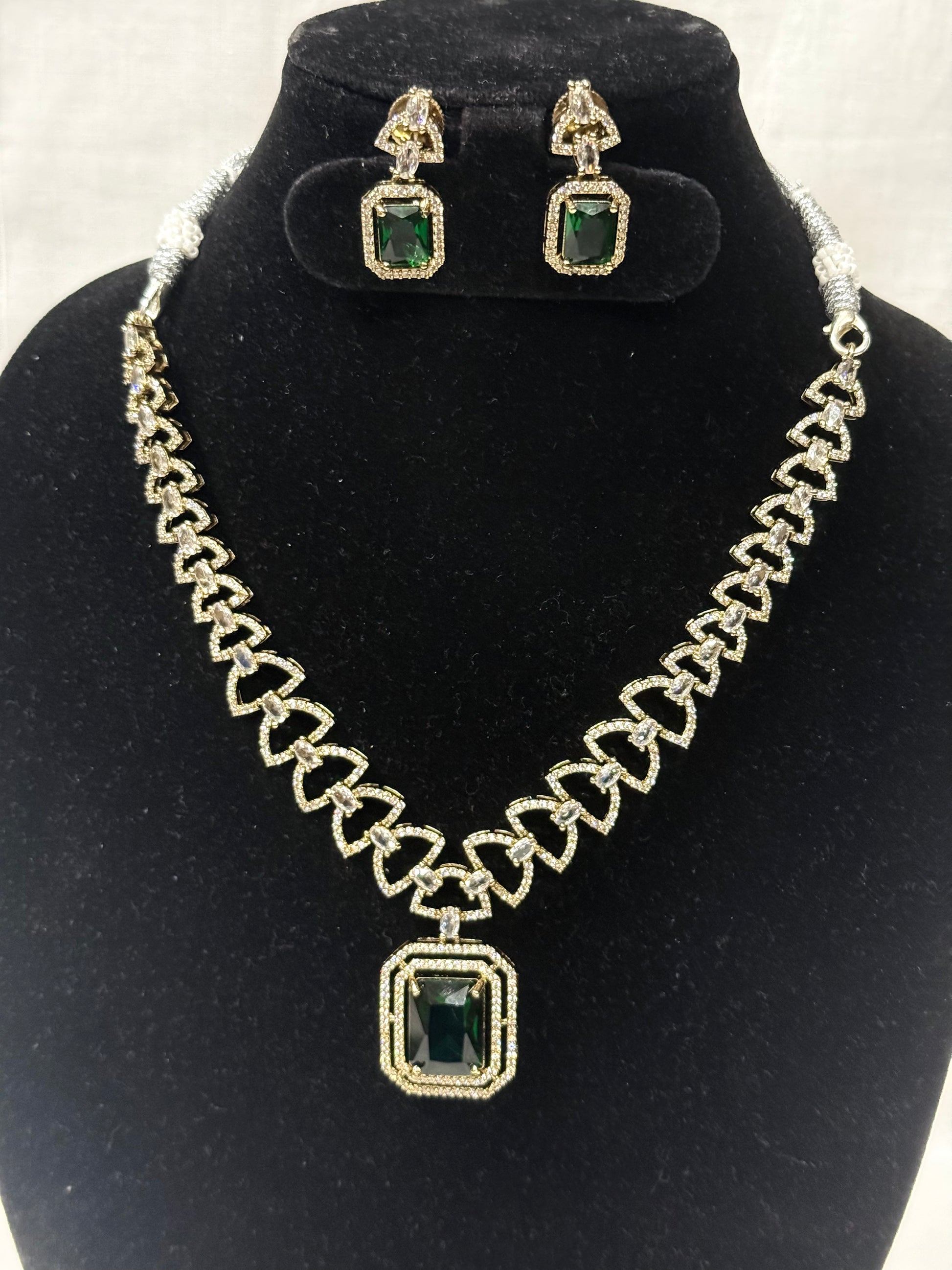 - Design: Features a striking emerald-green rectangular stone pendant bordered with sparkling ADs, held by an elegant triangular stone chain. Matching earrings complete the statement look.
