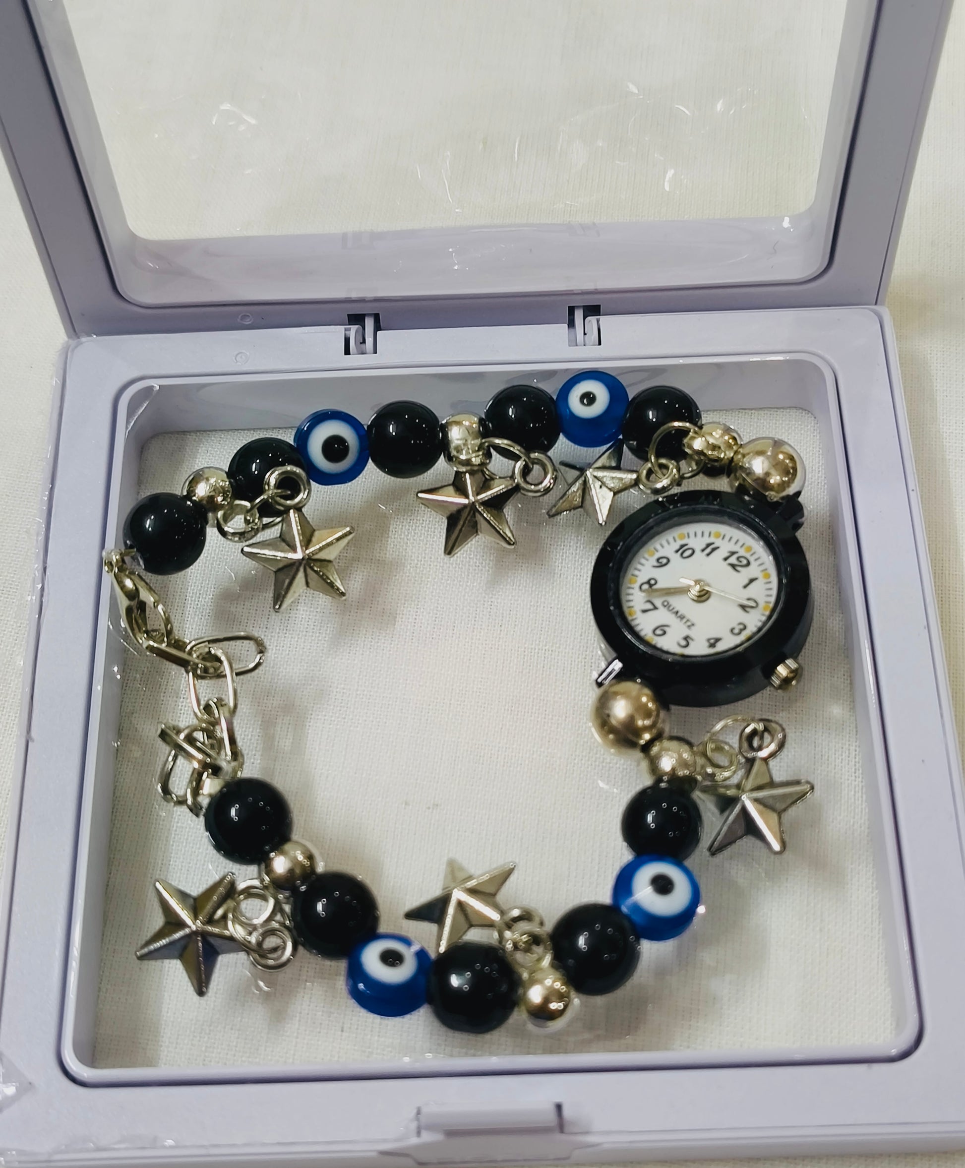 - Features: Black and blue evil-eye beads, silver stars, and round mini watch dial. Adjustable bracelet chain.