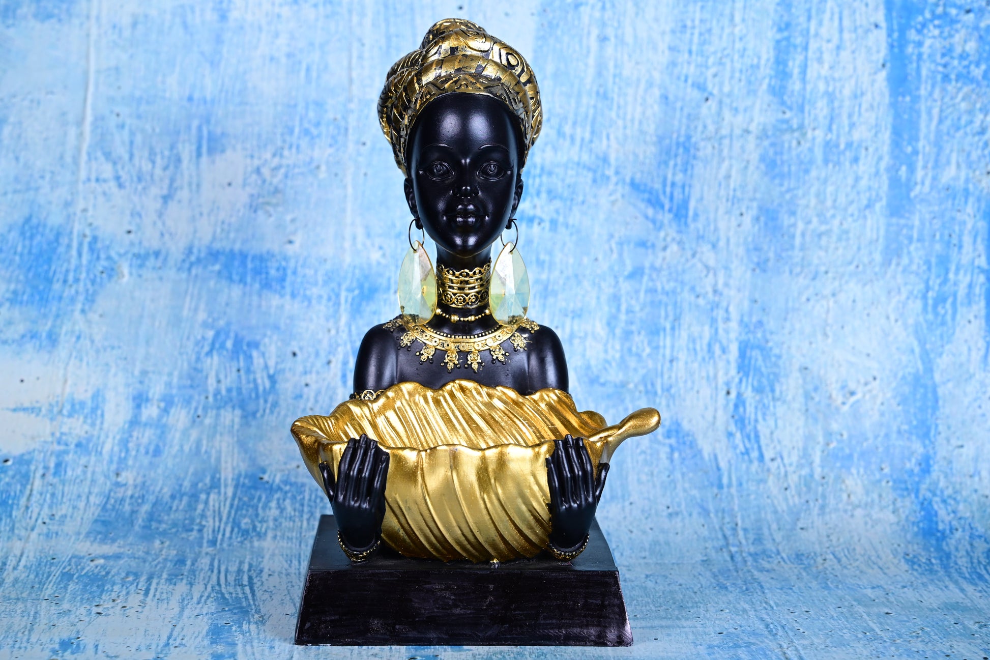This stunning Golden Grace Giver bust celebrates the power and elegance of womanhood through intricate artistry. Sculpted from high-grade polyresin, this 28cm beauty features a richly adorned African queen, hand-finished in a deep matte black tone with bold golden detailing across her headwrap, necklace, and sculpted shell bowl.