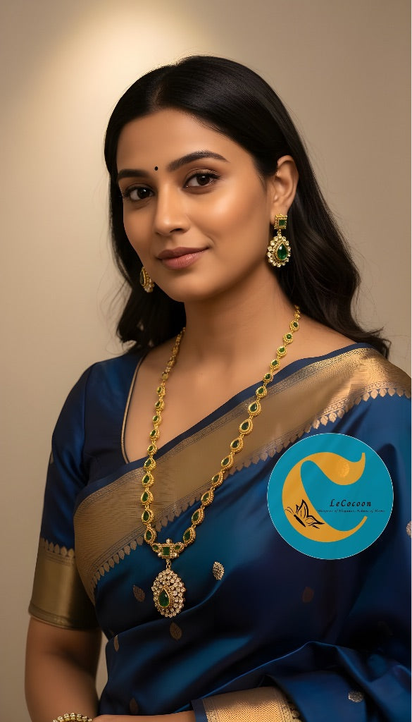 ✨ A royal green pear-drop necklace set with sparkling white stone borders, paired with matching dangle earrings. Perfect for weddings, temple festivals, and special occasions.