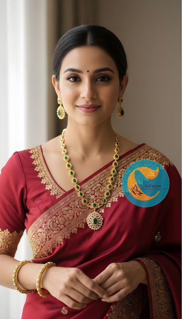 A stunning and elegant necklace set featuring tear-drop (pear-shaped) stones bordered with delicate zircon work. The set comes with a matching pair of earrings, making it perfect for weddings, festive occasions, and traditional gatherings.