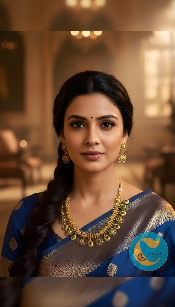 An intricately crafted Temple-Inspired Floral Necklace Set, available in striking variant – Green Stones. Designed with traditional motifs and delicate detailing, this necklace is paired with matching earrings, making it perfect for weddings, festive wear, and cultural celebrations. The unique floral and teardrop design reflects timeless South Indian heritage while complementing both silk sarees and lehengas.