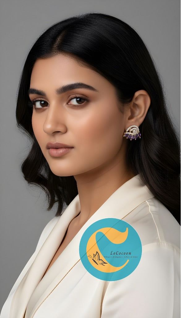 Delicate, dreamy, and dazzling — the Lavender Leaf American Diamond Stud Earrings are a poetic fusion of floral charm and modern finesse. Designed in an elegant curved leaf silhouette, these earrings feature marquise-cut lavender stones arranged gracefully atop a base of shimmering American Diamonds (ADs), all set on a gold-polished brass frame.