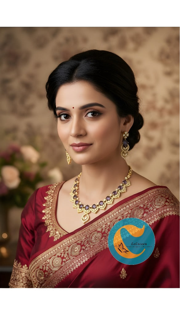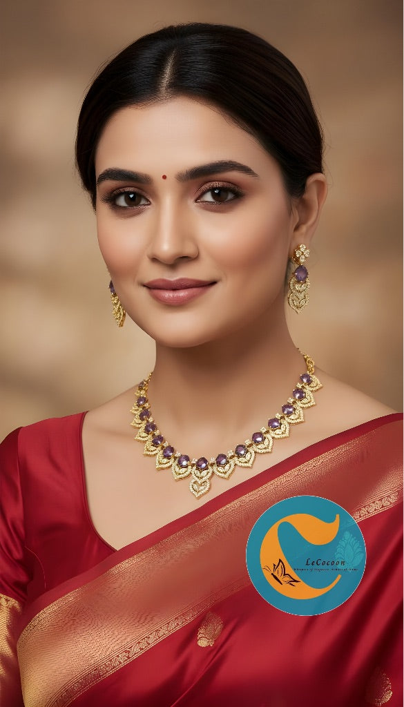 - Design: Adorned with purple cushion stones set in a leafy AD design necklace. Earrings with the same motif bring balance to the set.