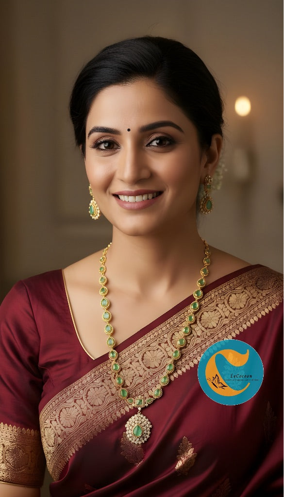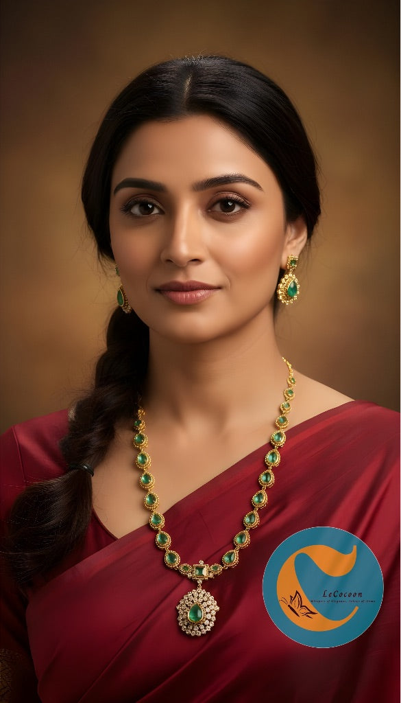 A stunning and elegant necklace set featuring tear-drop (pear-shaped) stones bordered with delicate zircon work. The set comes with a matching pair of earrings, making it perfect for weddings, festive occasions, and traditional gatherings.