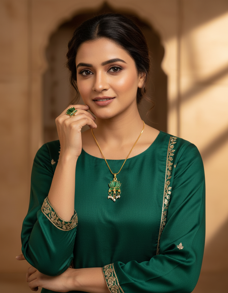 Inspired by the beauty of the lotus, this elegant pendant chain features a detailed enamel lotus motif paired with delicate pearl drops for a graceful finish. The set also includes a matching adjustable ring, making it a versatile addition to both everyday and festive looks. Lightweight and easy to style, it blends traditional charm with modern simplicity.