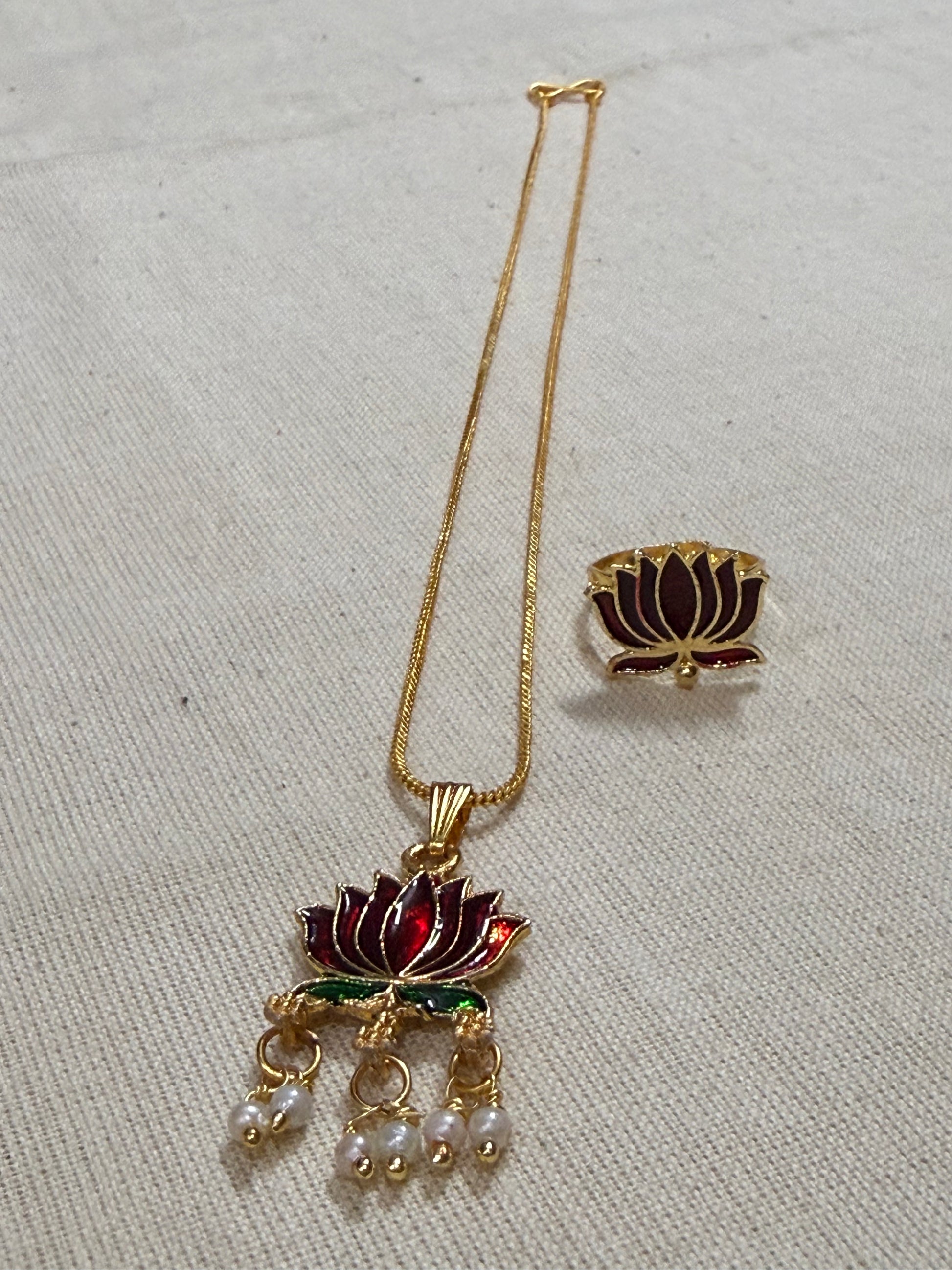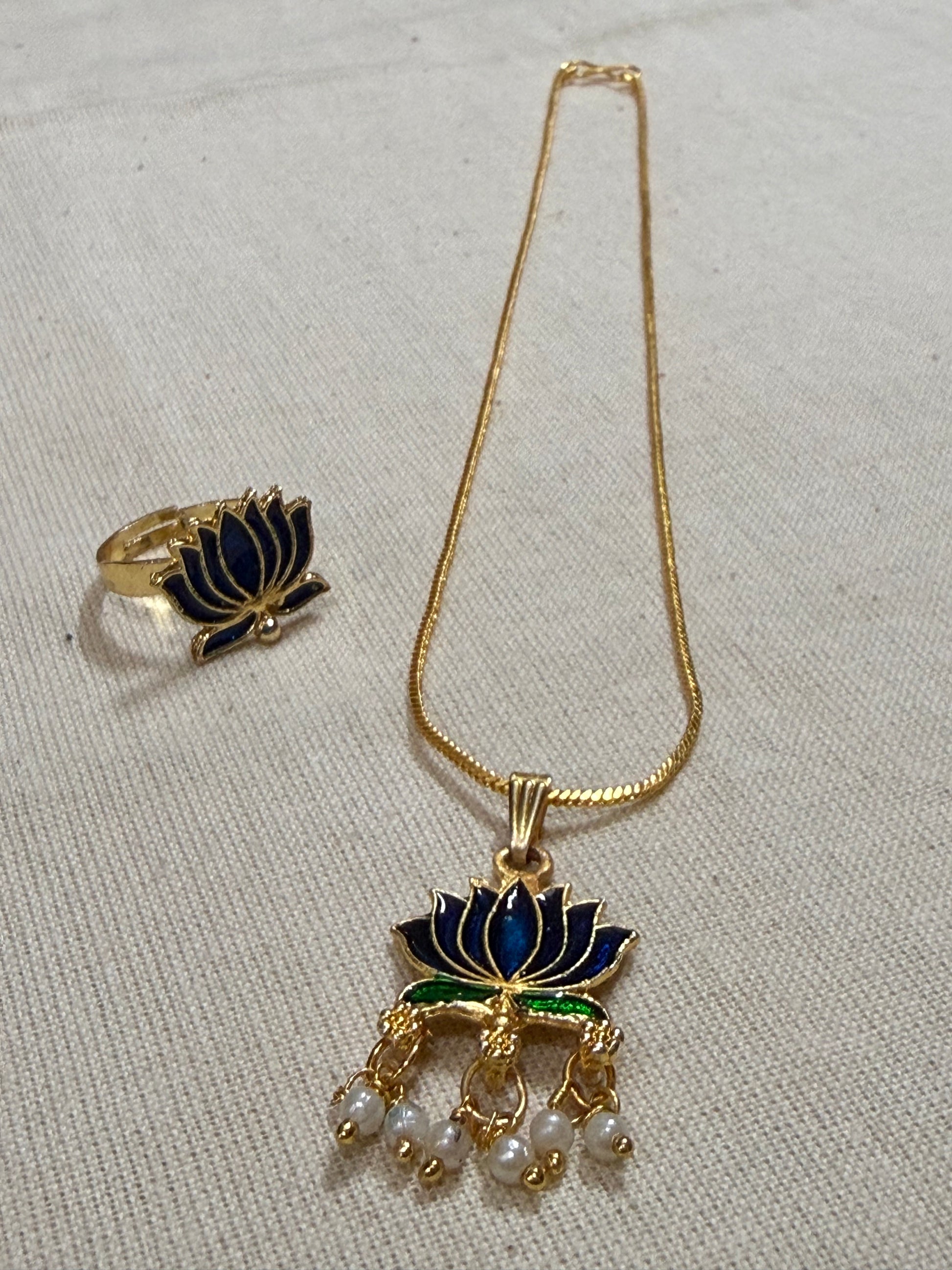 Lotus enamel pendant chain with pearl drops and matching adjustable ring.
