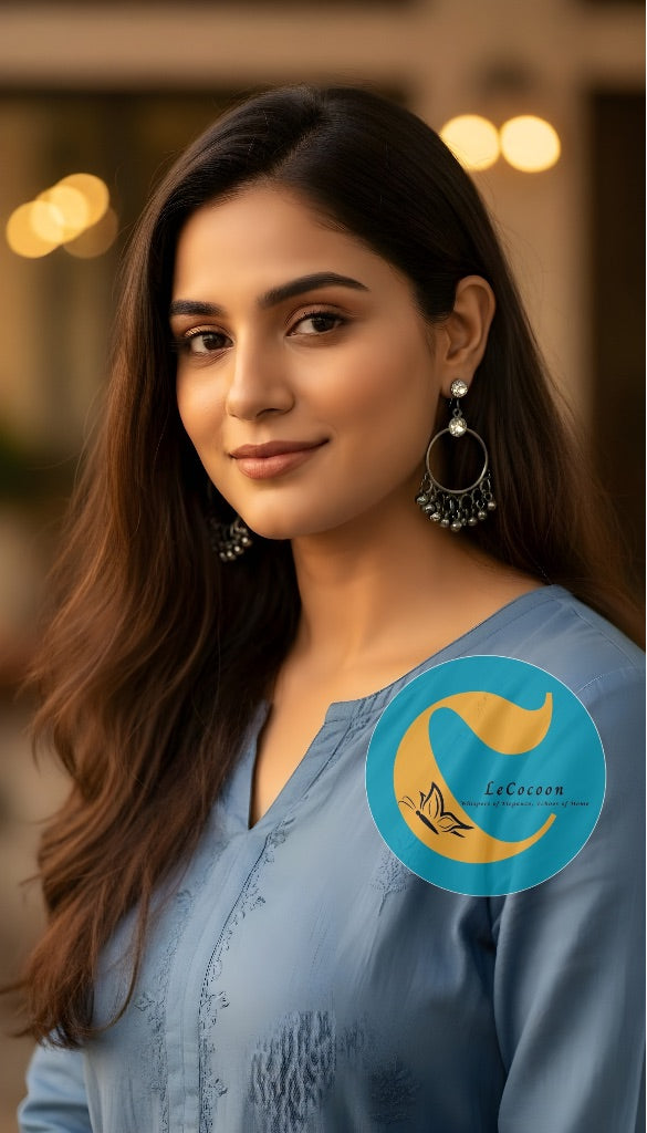 The design blends traditional Indian craftsmanship with a modern oxidized finish, giving it a bold yet versatile edge. Lightweight and statement-making, these hoops add a cultural flair whether paired with ethnic attire or fusion wear. Each piece captures the essence of Le Cocoon’s philosophy — Whispers of Elegance, Echoes of Home.