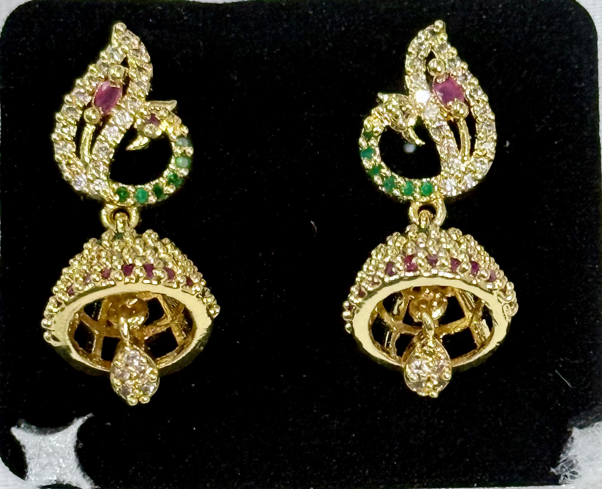 Celebrate timeless tradition with the Peacock Grace Ruby-Green Jhumkas, a breathtaking fusion of art and craftsmanship. The upper portion features an exquisite peacock-inspired motif adorned with emerald-green and ruby-pink stones, symbolising elegance and prosperity. The lower jhumka dome shimmers with a blend of CZ crystals and ruby accents, finished with a delicate hanging drop that adds graceful movement.