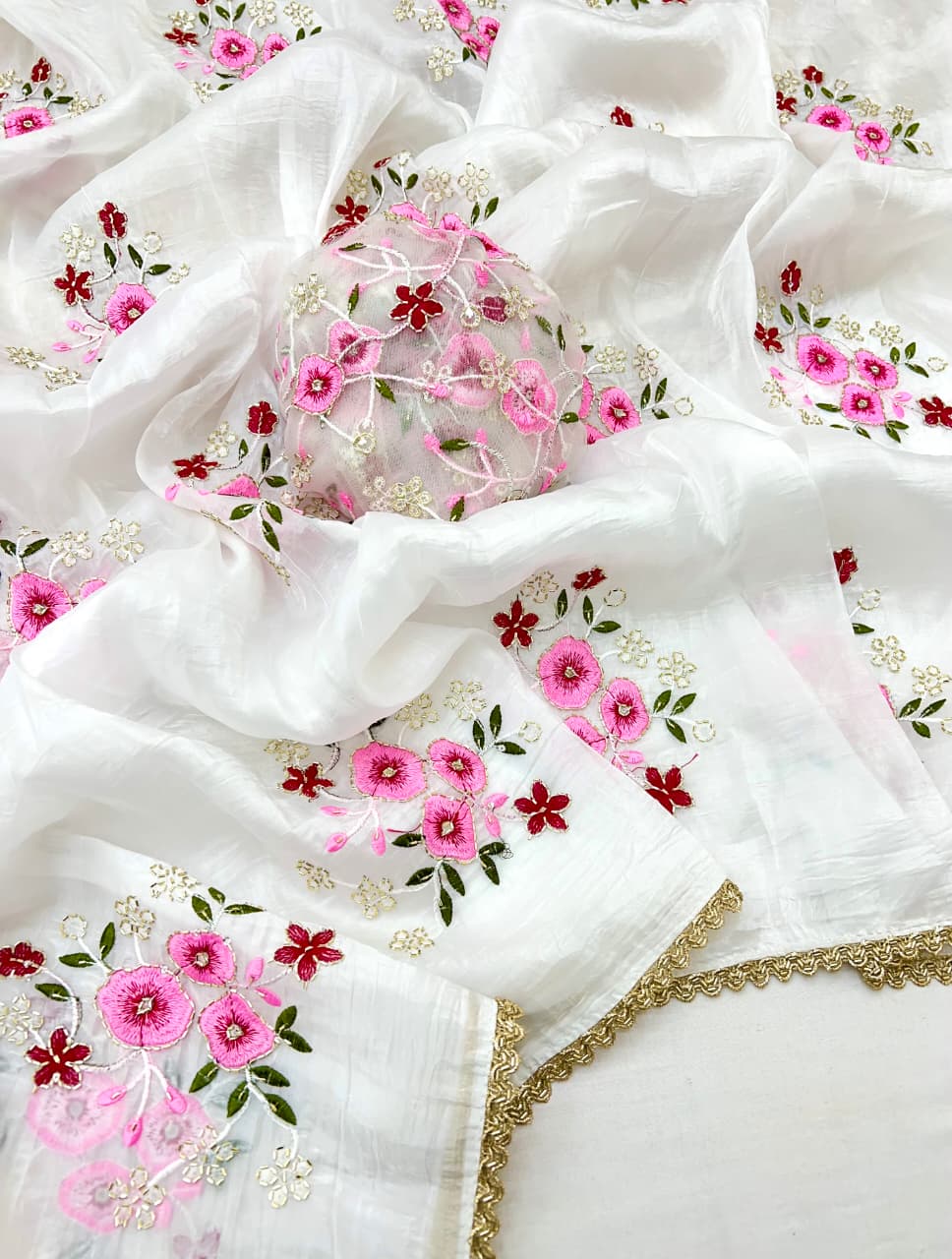 ✨ Ivory Bloom – Hand-Embroidered Pure Crushed White Saree Set