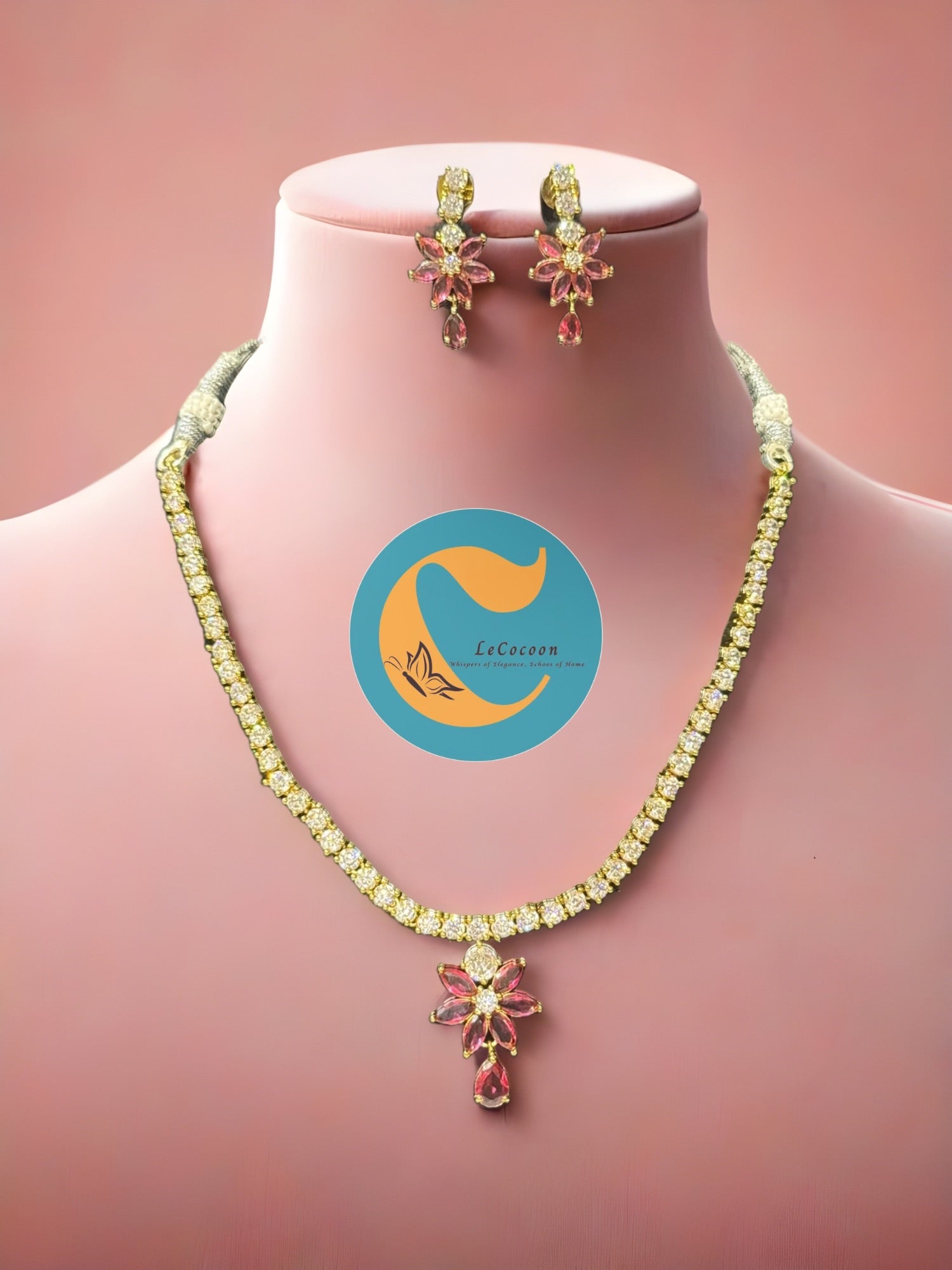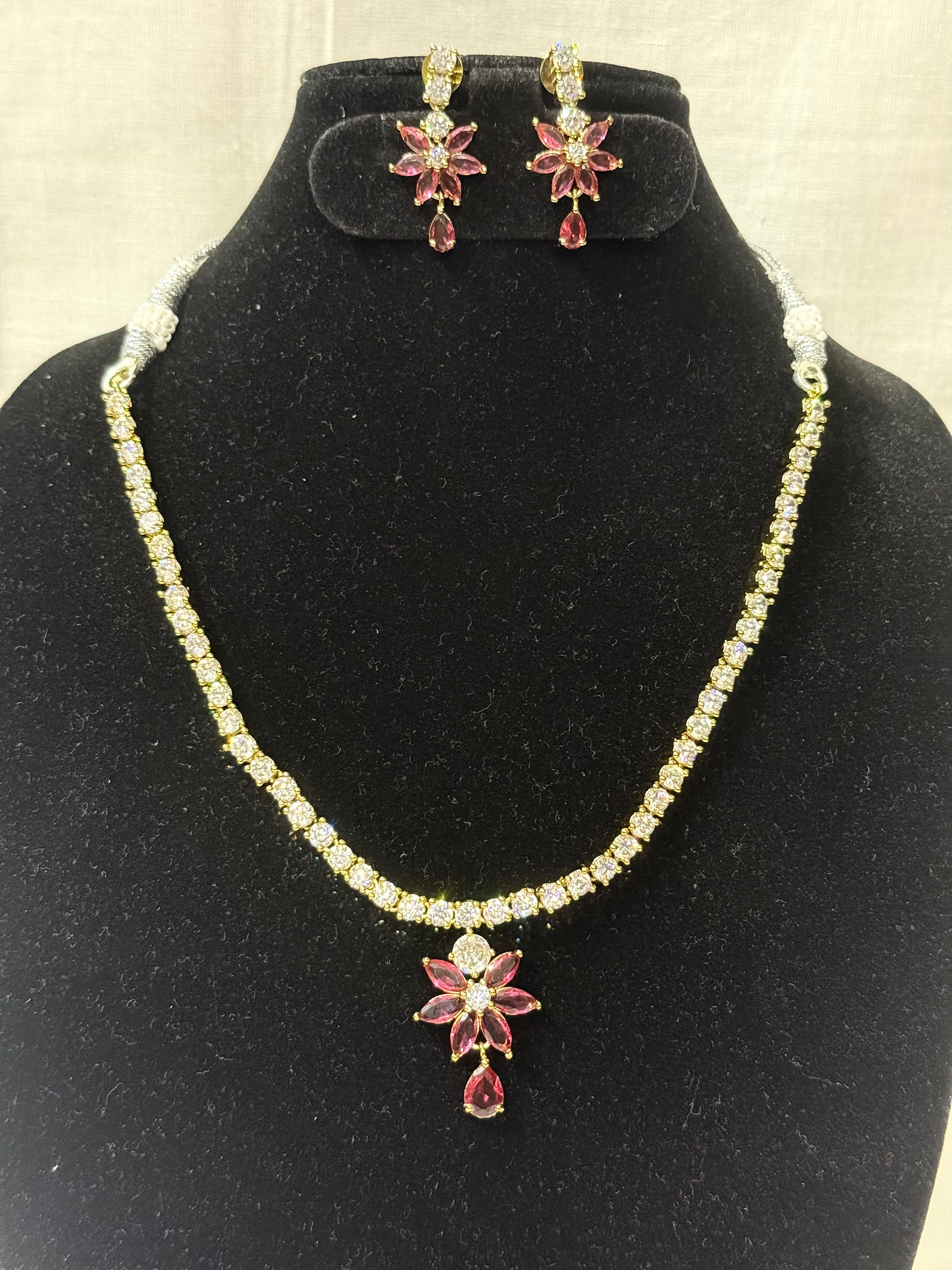Radiate feminine charm with this Pink Floral American Diamond Necklace Set.