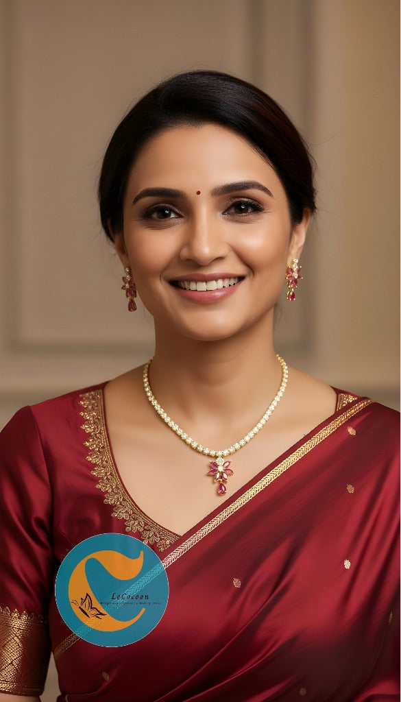 - Design: Crafted with round American Diamonds on the chain, with a central floral pendant designed in pink stones and a teardrop accent. Matching earrings enhance the overall grace.