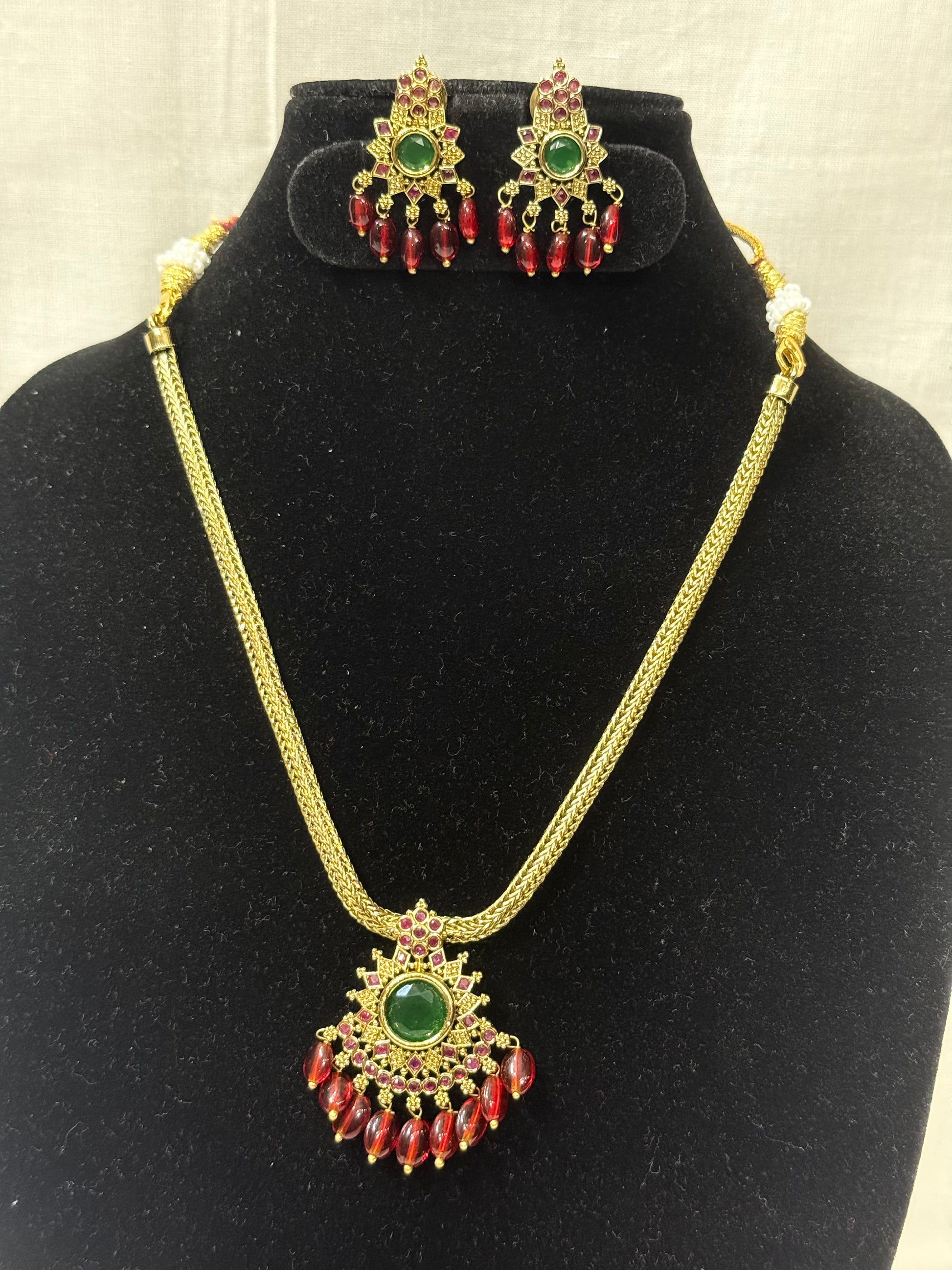 - Design: Features a dual-strand golden chain with a round green central stone, surrounded by red & golden detailing, finished with multiple red bead drops. Matching earrings carry the same traditional design.