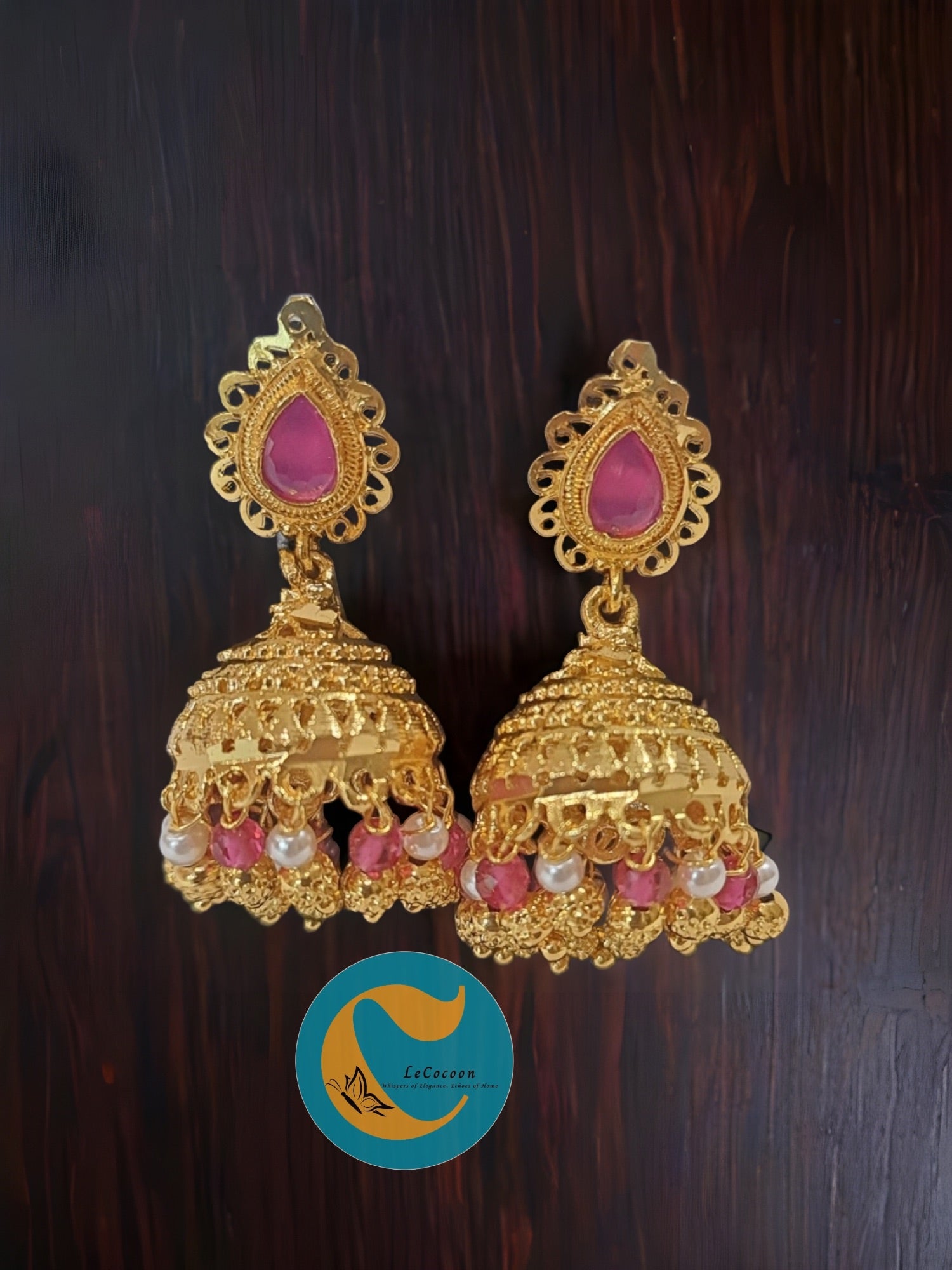 Bask in the brilliance of timeless Indian elegance with the Royal Radiance Ruby-Pearl Jhumka Earrings — a handcrafted symbol of festive luxury. The design features a beautifully carved teardrop ruby centerpiece encased in an intricate filigree gold frame, leading into a majestic dome-shaped jhumka with rich detailing. Each dome is adorned with alternating ruby red and pearl beads, creating a mesmerizing rhythm of color and movement. The warm gold tone, paired with traditional textures, evokes the grandeur of classical South Indian jewelry while maintaining a light, wearable finish — perfect for today’s modern celebrations.