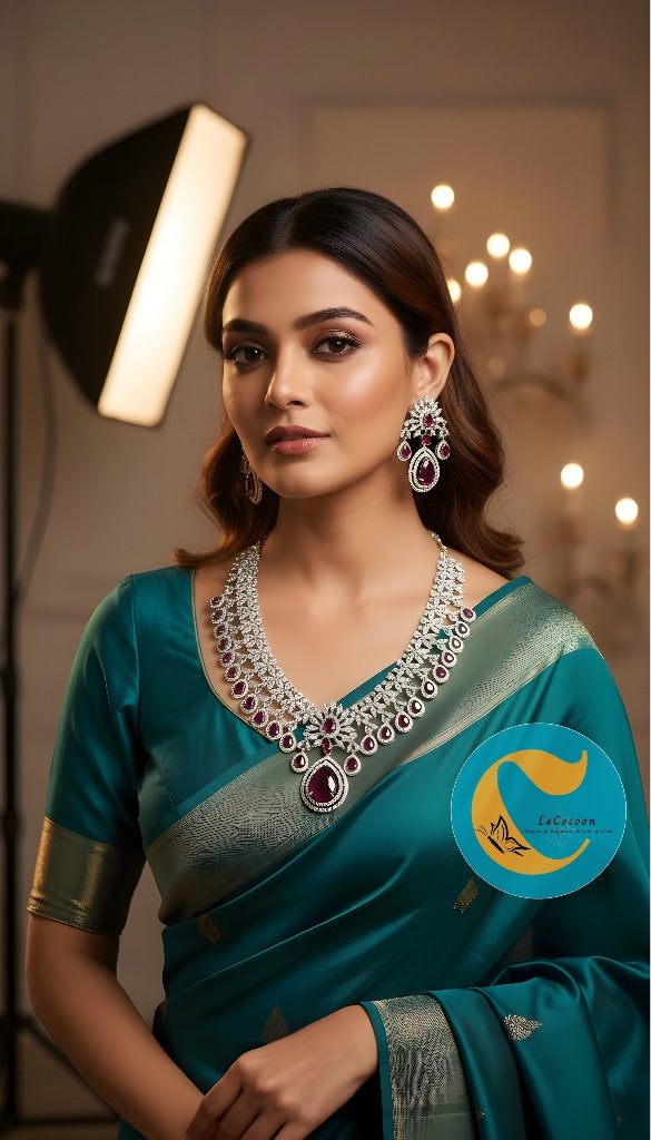 Add a royal charm to your look with this Ruby Red Bridal American Diamond Necklace Set.