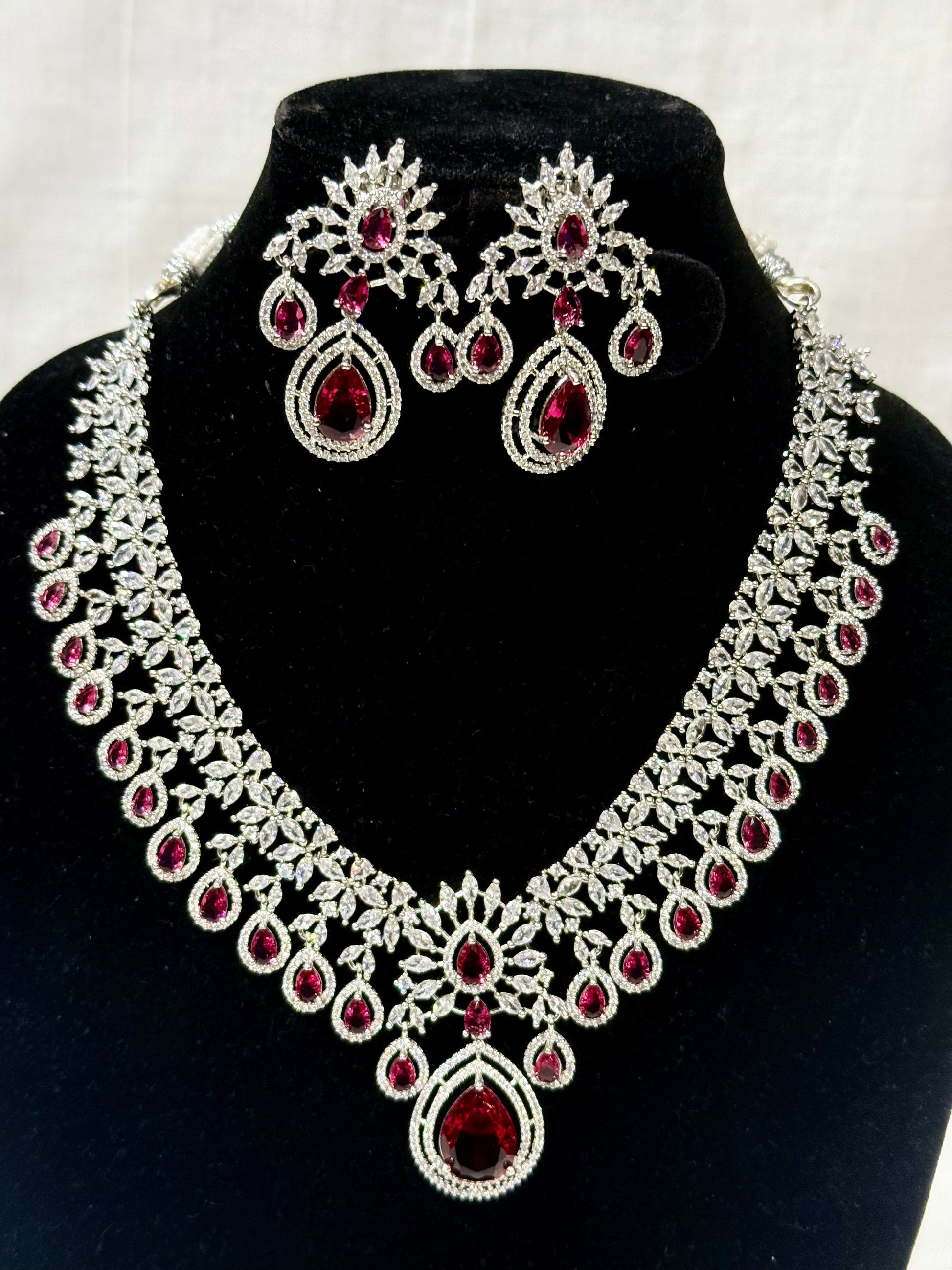 Ruby Red Bridal American Diamond Necklace Set with Earrings