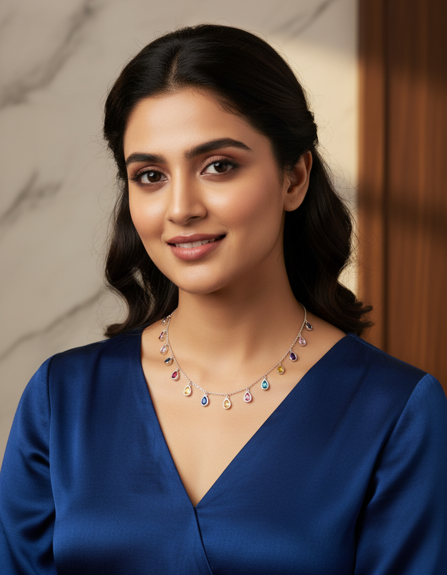 A graceful 925 sterling silver necklace adorned with delicate teardrop stones in soft, vibrant hues — designed to add effortless elegance to everyday and occasion wear.