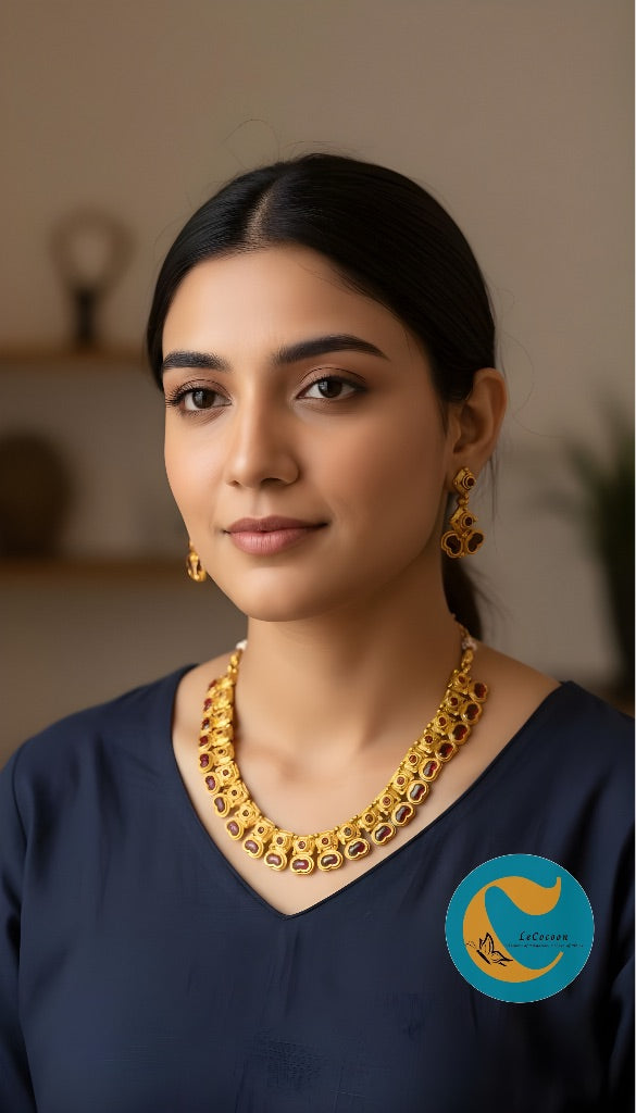 Discover Le Cocoon’s Kemp Jewellery Collection – traditional temple-inspired designs with red stone. Perfect for weddings & festivals.