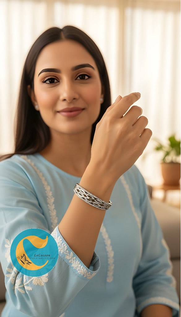 The bangle’s cool silver tone exudes understated luxury, making it a perfect blend of modern refinement and classic charm. Whether worn solo or paired with other pieces, it adds a soft yet captivating brilliance to any look — an embodiment of Le Cocoon’s philosophy: Whispers of Elegance, Echoes of Home.